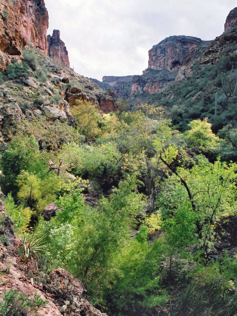 Green trees and bushes enclosing the creek - overgrown section of the canyon