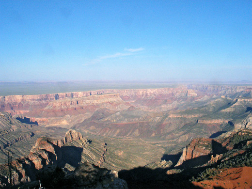 Nankoweap Trail. Much of the surrounding pine forest has been quite badly burnt in recent wildfires, allowing new groves of aspen to spring up. From the Imperial Point carpark, a very short trail descends a little to the flat rocks of the overlook, protected by railings because the land falls away vertically on three sides. The views are extensive and varied, encompassing the Echo & Vermilion Cliffs, the upper Colorado canyon (Marble Gorge), the dead flat, treeless plateau east of the river, and a large area of buttes and cliffs downstream to the south. This is a good location for watching a Grand Canyon sunset, owing to the amount of tributary ravines visible, and the high elevation.