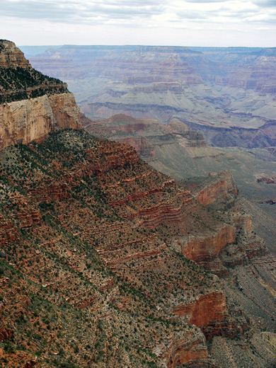 At road's end, the cliffs form a narrow promontory, jutting out from the plateau, and affording views of more than 180° of the Grand Canyon - a vista usually appreciated without any other visitors. To the west, the edge of the rim is formed by
