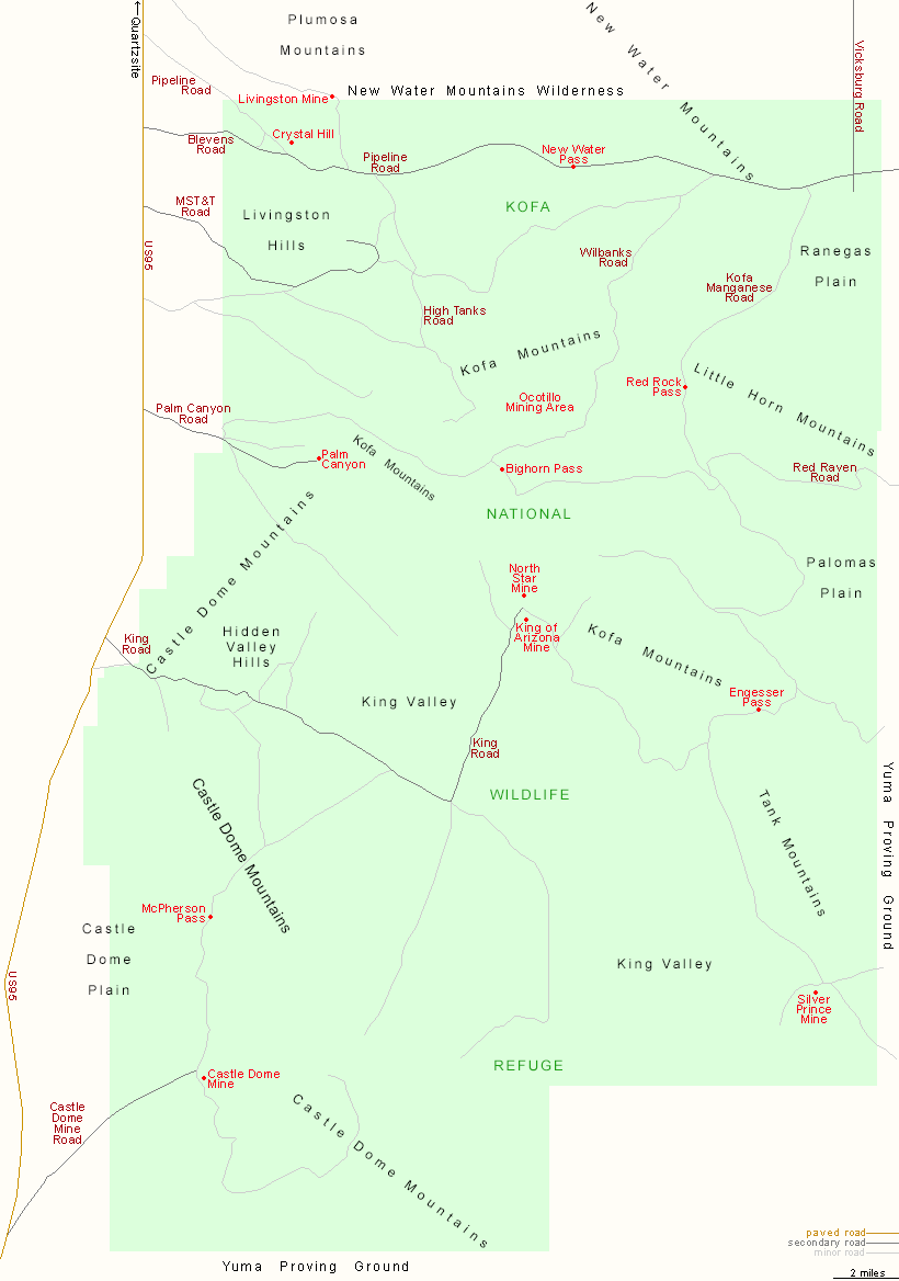Kofa National Wildlife Refuge, and the northeast corner is accessed by Vicksburg Road from exit 45, but most approaches are from the west, via side tracks off US 95 between Yuma and Quartzsite. Major routes are, from south to north, Castle Dome Mine Road, King Road, Palm Canyon Road, MST&T Road and Blevens Road.