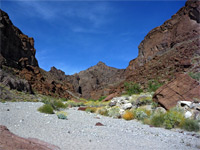 | 52. Kaiser Spring Canyon, Kaiser Spring Canyon and Burro Creek Length 7 miles (11.3 km); total, for the round trip Elevation change 500 feet (152 meters) Difficulty Moderate Rating (1-5) ★★★★★ A narrow canyon which leads to a wider, deeper gorge containing a warm spring, and then to the permanent stream of Burro Creek, which forms deep pools in springtime. All around are steep, volcanic rocks bearing many cacti. No trail, but easily explored by walking up and down the streambed. |