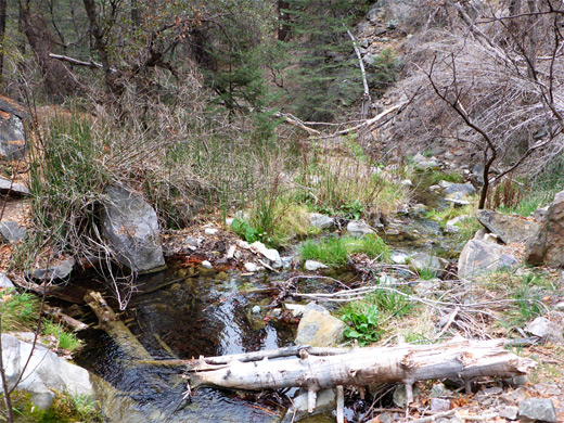 Not far beyond is a second, better overlook (at elevation 6,200 feet), where more of the canyon can be seen, and here the views extend east towards San Pedro Valley. This point is a good intermediate hike destination, and it seems that not too many people continue. The path stays level for a while before descending back to the streambed, which holds water all year, flowing between a line of low cliffs, over mossy waterfalls and through deepish pools. The trees are tall, the canyon tranquil and unspoilt. The trail crosses the creek at several places, one within a section liable to be dry for most of the year, and passes a junction with the Brown Canyon Trail from the north. Beyond here the landscape remains similar - a relatively wide though always shady canyon, with the path a short distance above the creek on one side or other, as the drainage sometimes flows through slightly enclosed sections with a few rocky outcrops, while in other places it winds between boulders and fallen logs. The next junction is at the upper fork in the canyon, just before the site of Hamburg Mine, where relics include a few iron objects and some overgrown spoil heaps. The two onwards paths, up Pat Scott and Wisconsin canyons, appear very little used.