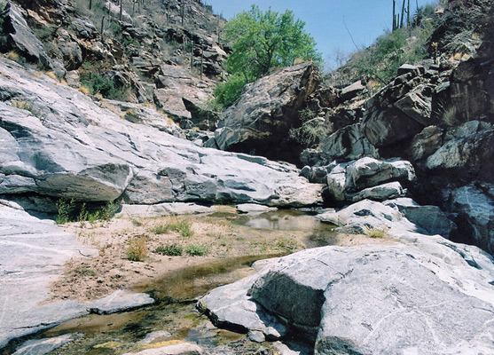 After 1.5 miles, the path starts to climb quite high above the streamway on the south side, to avoid an entrenched section containing several dryfalls and narrow channels. It forks half a mile further; the main (right) branch continues climbing steadily, curving around a side ravine and up Bear Canyon for 3 more miles to a junction with other paths in the Coronado National Forest. The left fork is a spur path that descends to a rock plateau at the base of the Seven Falls, the most photogenic feature in the canyon, where it gains 200 feet in elevation via a series of water-polished chutes and terraces. When flowing (usually from October to May), the stream forms many pools and cascades, plus the seven main waterfalls; some of the largest pools are deep enough for swimming. The exposed granitic rocks are quite pretty - grey to white in color, crossed by mineral veins, and slippery when wet. There is no official trail to the higher falls though climbing up is quite possible, on the right side of the stream, past some spots that need a degree of caution. Above the falls, the canyon bends back to the east and the terrain becomes more level, though still pretty, as the creek flows slowly through pools and rocky channels. The round trip to the top of the falls and back takes from 2.5 hours.