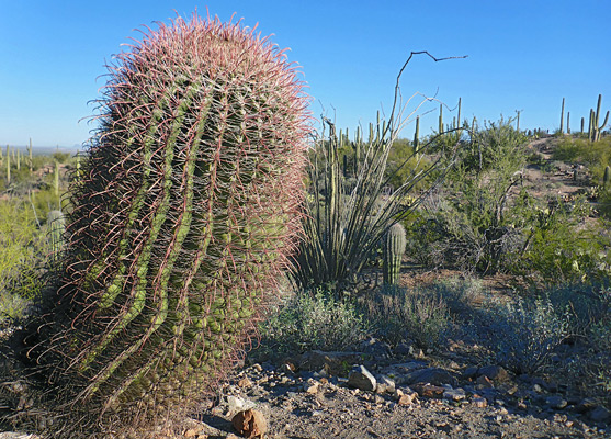 Arizona barrel cactus (ferocactus wislizeni), later becoming just a bit more spread out, the ground grassier, with mesquite and ironwood trees, as the path gradually comes close to a road and so experiences some traffic noise.