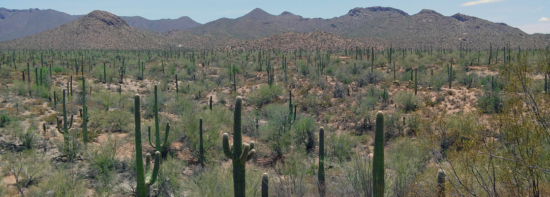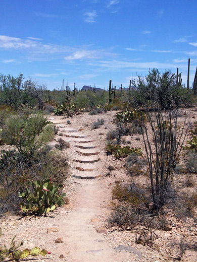 Signal Hill is a popular destination, but few hikers continue beyond, along the Cactus Wren Trail which forks off to the north just before the summit of the hill; a sign gives distances as Encinas Trail 0.9 miles, Manville Trail 1.3 miles, and Rudasill Road access 1.7 miles. Another junction is passed soon after the start of the Cactus Wren Trail, with the southern end of the Manville Trail, while the main path proceeds northwards, over sandy flats and a number of dry washes, eventually leading to the monument boundary along Sandario Road, by the junction with Rudasill Road. From here, the 2.5 mile Manville Trail provides an alternative route back, and both routes intersect the Encinas Trail, which allows a shorter loop, 3 miles instead of 4.5 miles. However, the views along the paths are little changing, and the west side of the loop is close to Sandario Road and so affected by traffic noise; trails further east, nearer the Tucson Mountains, offer a better option for longer hikes in this section of the national monument.