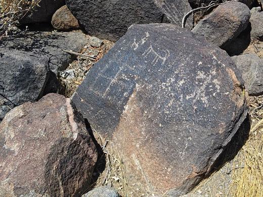 Two trails leave from the north side of the parking area, descending slightly via some rock steps, alongside stony ground covered with opuntia, cholla and ocotillo. One of the paths passes another picnic ramada and then joins the other, just before crossing of a gravelly wash, usually bone dry. More steps on the far side take the trail to the base of the hill, and around the east face to a railing-protected viewing area on the north side, where many petroglyphs are in view. Several notices encourage visitors not to leave the path in order to protect the inscriptions. Many of the designs are faint due to centuries of weathering, but a reasonable number are crisp and legible. Designs are mostly animals, plants, human-like figures and geometric shapes, including several intricate spirals. Also often glimpsed hereabouts are rattlesnakes, as the cool crevices between the boulders are ideal habitat.
