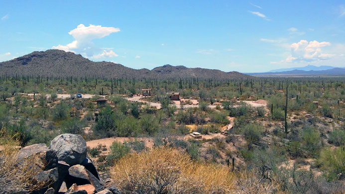 Golden Gate Road; both routes are unpaved, but good for all vehicles. The spur crosses fairly open, flattish land covered by the usual range of cacti including a fair few saguaro, ending in a loop parking area with restrooms and picnic tables, some covered. Signal Hill can be seen close by to the north, rising above a line of palo verde trees.