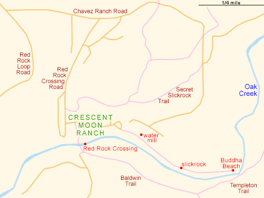 The ranch grounds extend a little way to the east - the old house and water mill are on the edge of a meadow, bordered by cottonwoods and the creek to the south, and red rock slopes to the north. A path continues through thicker woodland to a sizable red plateau containing seasonal potholes, one of the best places to photograph Cathedral Rock, then a little further is another open area known as Buddha Beach, next to a deep section of the creek suitable for swimming, a place also accessed from the opposite side via the Templeton Trail.