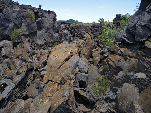 Bonito Lava Flow, which is one of three large volcanic deposits in this part of the San Francisco field (the other two are the Kana-a and Strawberry Crater flows, a few miles northeast). There is no trail through the main area of lava, north of the road, and while off-trail hiking is allowed it is generally difficult to make progress over the jagged black landscape due to the extremely sharp, uneven and-brittle-rocks. Most of the lava is the aa type but the smoother pahoenoe variety is also seen, and the flow contains other characteristic features such as ravines formed by collapsed lava tubes (where molten magma continued to flow beneath a solidified crust), and squeeze-ups - thin, sharply edged ridges of lava that pushed up from underneath cooler overlying deposits.