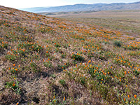 The reserve is reached from Lancaster in the east by Avenue I, a straight road passing steadily less-developed surroundings, eventually entering slightly hilly terrain, and curving round a few bends to the entrance. The road, now known as Lancaster Road, continues 12 miles west to an intersection with Hwy 138, which meets Interstate 5, 14 miles further. The entrance fee for the reserve is $10 per vehicle (2020), perhaps relatively expensive compared with some other places that have more varied scenery, though pedestrian access is free and cars are allowed to park along the main road once 100 feet away from the turning; from here the visitor center is reached by a half mile walk. The road verges are also used if the official parking area is full up, a common occurrence on weekends at the peak flowering season. Other fields and hills all around the reserve have equally fine displays of the poppies, though much of this land is privately owned.