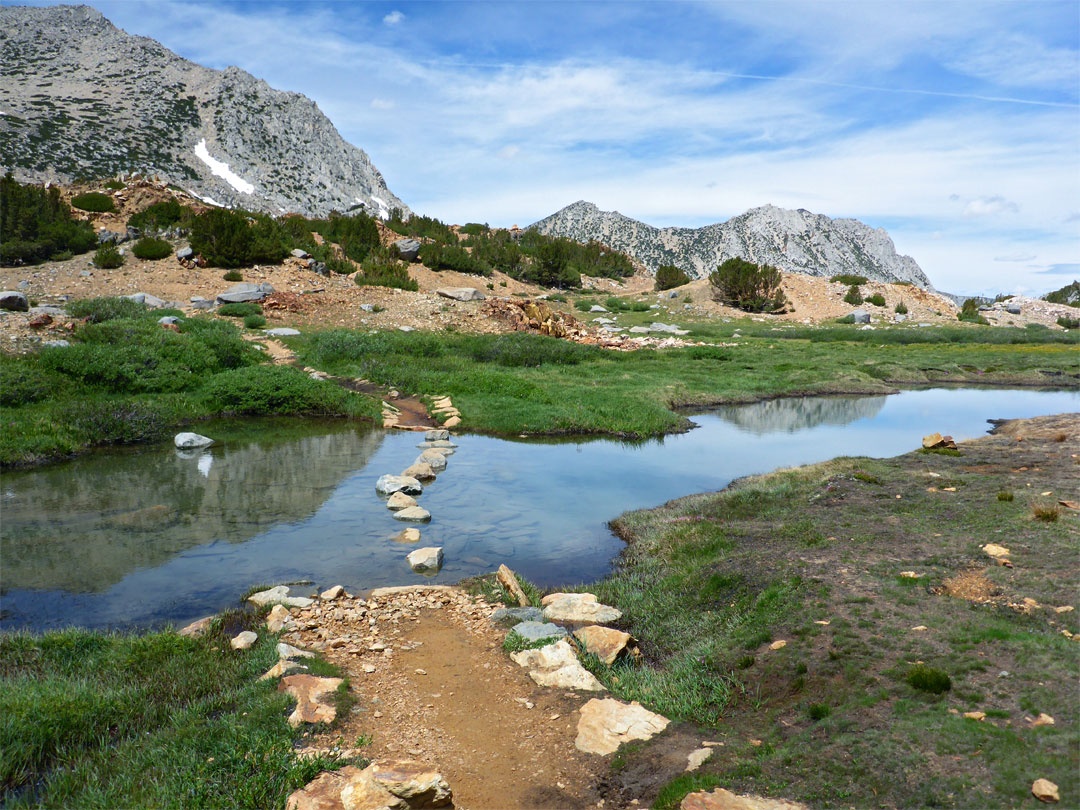 Keywords: Eastern Sierra, the Bishop Pass Trail, California, ponds, pools, paths, stepping stones