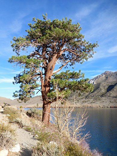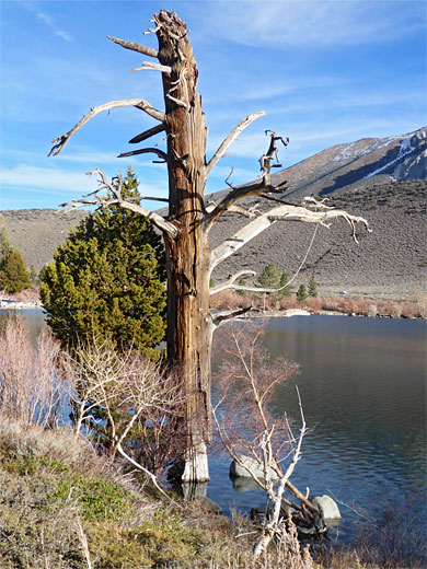 The trail continues, via a few boardwalks, past a junction with a stock bypass trail to another intersection, where the path upcanyon branches off, the first destination being Mildred Lake, 3.3 miles. The loop path now traverses the northwest side of the lake, the ground lightly covered by sagebrush and other shrubs, with just a few large, isolated pines and some standing dead trunks. The final section is bushier, as the path descends to the shoreline, past a boat ramp and meeting a road, which runs along half of a mile of the shore, past several parking places.