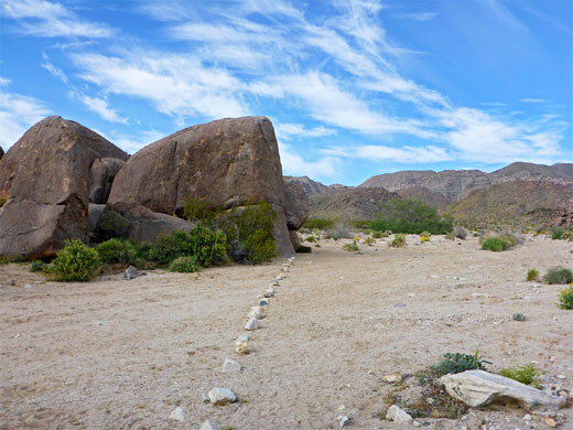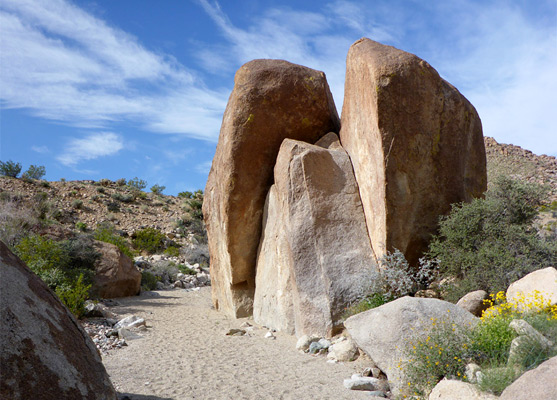 The narrow but well-defined path heads southwest over a bushy, sandy flat, reaching the edge of a wash after 600 feet, on the far side of which are two piles of large boulders. The next section of the route is up the wide wash bed, which lacks any rocks or thick undergrowth, and its floor of firm sand makes for easy walking. The wash divides soon after another bouldery hill to the north, and the path resumes up the low ridge between the two forks, following close to the northern branch. An alternative is to stay in the wash; this narrows somewhat and has a few pretty bends, between shapely granite boulders. The trail descends back to the floor of the wash just as another tributary joins from the north, then continues up the far side, again between the two drainages, the larger of which continues all the way to the mine, though the upstream section is temporarily much more difficult to follow, containing many big rocks and one sizeable, sloping dryfall, so the path is definitely the best way to continue.