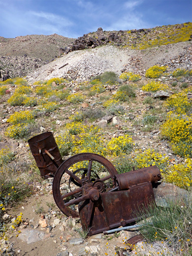 The trail, now recognizably an old vehicle track, climbs over stony slopes, round a broad basin and over a saddle, where it turns north, heading directly to the mine, which is visible from some distance away. The route gradually descends towards the streambed, then narrows and fades away in the vicinity of the mine spoil heaps. Just above these are three shafts sealed by iron grills, while nearby are several large pieces of rusting machinery including an engine, motor, winch and compressor, plus many smaller items, of wood, metal and glass. A short section of rails run from one shaft to the edge of its spoil heap. All around are steepish slopes covered by small boulders, mingling with red-spined