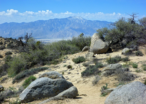 The highest sections give a 360 degree view of the surroundings as there are no significantly taller peaks nearby; the vista extends south across Coachella Valley to the San Jacinto Mountains, west to the San Bernardino Mountains and northeast to the Mojave Desert.