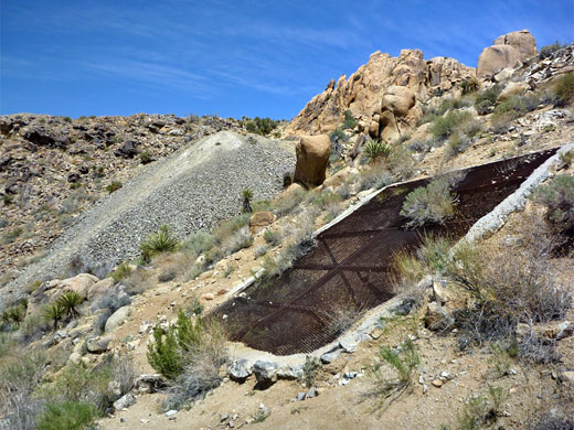 Barker Dam and Hidden Valley, while the other branch ends soon after at the Desert Queen Mine trailhead, which has space for about a dozen vehicles. The less used path to Pine City heads northwards, while the route to the mine is east; this crosses whitish, sandy terrain, intensely hot in summer, and reaches a junction after a few hundred feet, left being a spur to a viewpoint of the mine. The right branch winds down the hillside, past a ruined stone cabin to the floor of a sandy wash, then up the far side a little way to some of the mine emplacements. Relics include shafts and adits (all securely sealed), spoil heaps, and several iron objects. Though much less used, the path does continue beyond the mine, through hilly land for 1.5 miles to the parking area at