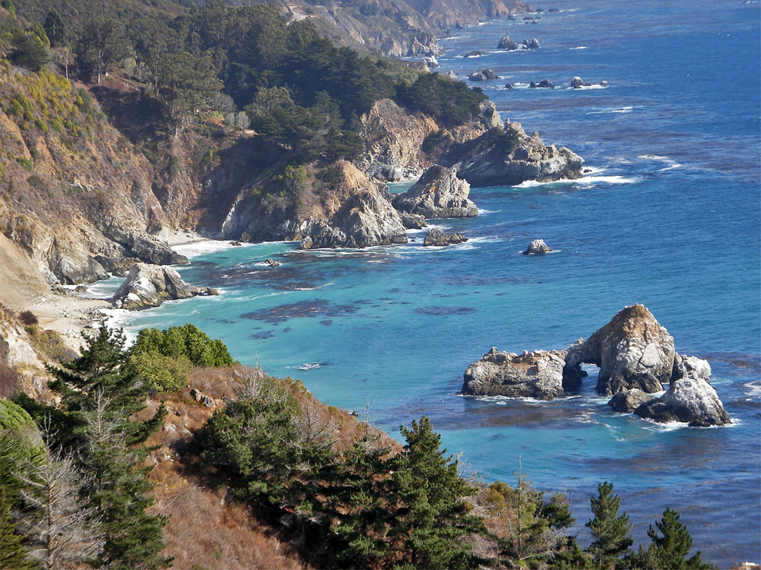 Keywords: Julia Pfeiffer Burns State Park, California, Pacific Ocean, beaches, sea, viewpoints, waves, blue water, coastal mountains, Highway 1, rocks, arches, Big Sur