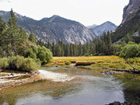 One of Kings Canyon's more spectacular cascades, Mist Falls are reached by a relatively easy trail that starts from the end of the park road and follows the flat valley floor eastwards