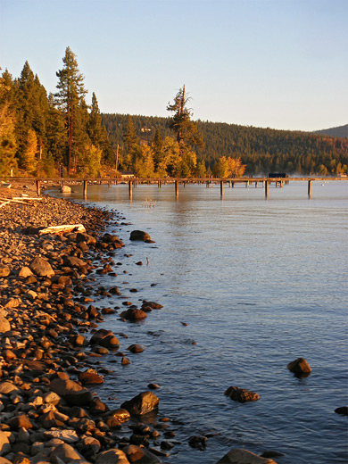 Tahoe State Recreation Area near the small town of Tahoe City, which has a campground, beach and picnic area. Just outside town is one of the few through routes to the west side of the lake (CA 89), which follows the fast-flowing Truckee River northwards, and links with the main northerly trans-Sierra highway I-80. The evocative