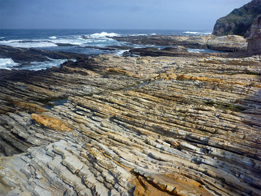 Hazard Reef), reached by a very short trail from a shady parking area one mile beyond the Sand Spit turn off. The reef is representative of all formations in the park, which range from flat, level terraces, ideal for walking across, to vertical cliffs guarding inaccessible coves, and all angles in between. The component strata are inclined, and thin-layered; the most characteristic erosion behavior is to form long, thin spits perpendicular to the shore, with narrow inlets in between. The color of the sedimentary rocks (Miguelito shale) ranges from