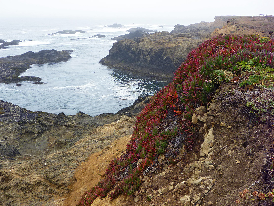 Reddish-leafed iceplants (carpobrotus chilensis), on the edge of the bluffs south of the lighthouse