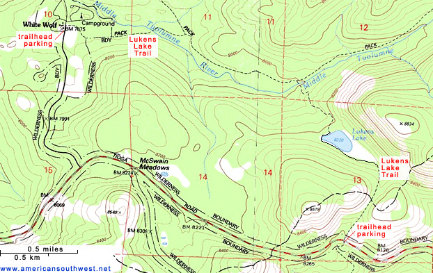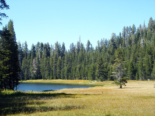 The southern trailhead has an ample parking area at a pullout along the Tioga Road, a location that is also the start point for a lesser used path heading south towards Yosemite Creek. The Lukens Lake Trail climbs slowly through well established forest of particularly tall, thick trees, though many of the largest specimens have been severely burnt in a wildfire. The path reaches a low saddle then descends through undamaged woodland to the edge of the lake, which is bordered on the east side by a sizeable area of tall grass marsh, sprinkled with wildflowers in early summer. The route originally crossed the meadow and ran along the north shore of the lake, but this has been changed fairly recently because of damage to the meadow - the deepening path was affecting drainage and harming the plants. Now the trail takes a slightly longer course around the south and west shores, before crossing the small outlet stream and re-entering the thick forest, descending fairly steeply by 200 feet towards the larger drainage of the Middle Tuolumne River, which is then followed for 1.5 miles to the White Wolf campground, passing smaller meadows and a few tiny streams. There are two junctions on the way, with longer trails to the Ten Lakes and the Grand Canyon of the Tuolumne.