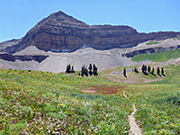 The unsignposted trail to Mount Dana begins right next to the NPS toll booths at Tioga Pass, so vehicles can be left either in one of the two small parking areas a short distance west of the park entrance, or along wide verges on the east side. The first half of the path is as wide as many official Yosemite trails, but rather steeper, eschewing the usual switchbacks for a direct course up the hillside. The route starts off quite level, crossing partly wooded land at the upper end of Dana Meadows, past three shallow, reflective ponds and on towards the far side of the valley, where the ground begins to rise. The trail veers southwards, ascending diagonally up the slope then turns back east, at the start of the main climb. A few lodgepole pines persist a little way up, mixed with patches of wildflowers, growing quite thickly in a moist area around a streamway, before giving way to short grass and scattered Alpine plants. Some sections are a bit slippery owing to loose soil between boulders, but most of the remainder is firmer, until near the summit where the mountain is covered by larger rocks, jagged and somewhat unstable.