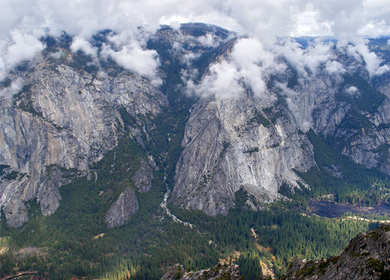 Near this second junction are a series of narrow, vertical-walled cracks in the edge of the granite cliff, known as The Fissures. The path follows close to the rim for a short distance and ends at a small, railed, north-facing overlook which has good views across a ravine to Profile Cliff, a vertical, unusually cracked and striated wall of granite. A fair amount of Yosemite Valley can be seen though better is to walk further west right to the far edge of the point, where the rim is unguarded and precedes an almost sheer drop of 1,600 feet. From this promontory Yosemite Valley is in full view up and down, from the peaks of Cathedral Rocks on the south rim, across El Capitan Meadow to its famous neighboring cliff, then east over Eagle Creek, the Three Brothers and Yosemite Falls.