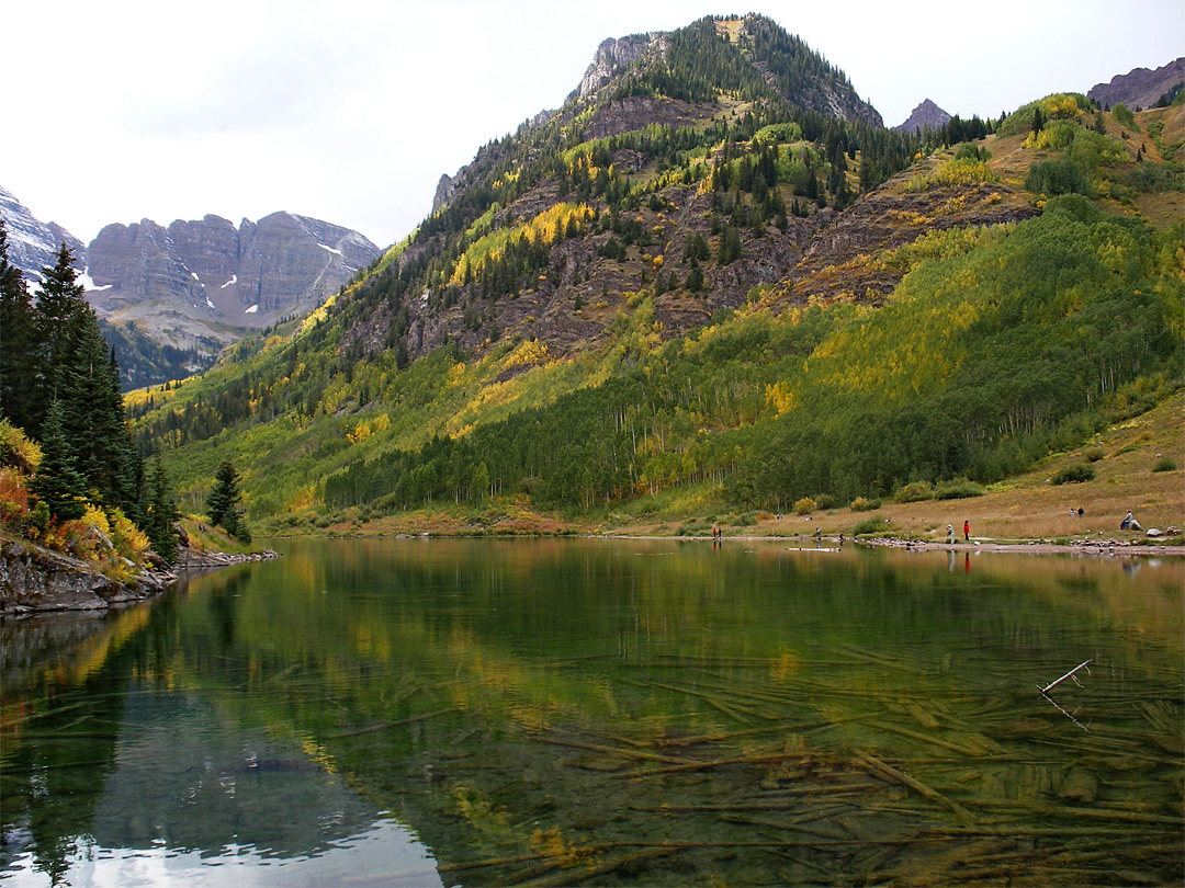 Keywords: Maroon Bells, Colorado, reflections, lakes, water, forest, trees, yellow, green, summits, snow, Elk Mountains, Rocky Mountains, White River National Forest, wilderness