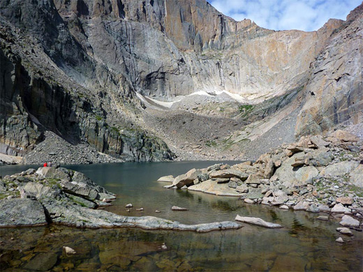 Chasm Lake, situated in a glacial bowl beneath the steep east face, surrounded on three sides by precipitous slopes of rock and scree, part of which holds a permanent snowfield (