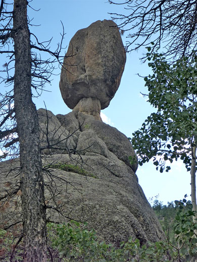 The one mile Balanced Rock Trail starts with a gentle descent, followed by a slightly longer but still not too steep ascent, passing several other balanced rocks on the way to its end point at the base of the main one, located on the east side of a valley; the land falls away by several hundred feet to the west. The rounded granite formation is best visited in the morning, as the easiest viewable face is in shadow in the afternoon, with the sun directly beyond. The top of the rock is about 30 feet above the path and all is enclosed by tall trees so the views are quite limited, and if truth be told the formation is not really that special. The location is 3.9 miles from the Lumpy Ridge trailhead, but this can be reached in only 2 miles by walking due east, through woodland over a wide ridge, passing several small granite summits and descending into a ravine. Following this downstream intersects the Gem Lake Trail about a quarter mile south of the lake. The cross-country route is not always obvious, however, and some places have thick undergrowth.