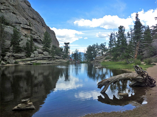 But Gem Lake is the main destination, and the route here begins by following a ravine northwards, climbing fairly steeply up to the junction with the connecting route past the Twin Owls. The surroundings now are a mix of light pine/aspen woodland and open patches, with a floor of coarse granitic sand and rounded boulders. Gaps in the trees allow views of vertical cliffs topped by rocky summits, which rise high above to the west, while occasional promontories to the east provide good vantage points overlooking Lake Estes and the eastern part of Estes Park. The undergrowth becomes a little denser as the trail enters another, cooler ravine, climbing by a few short, steep switchbacks and steps made of granite blocks. The trail ascends above the ravine, veers east and comes out to the shore of Gem Lake, which is bordered by low, vertical, layered cliffs on one side, and a gravel beach on the other. A sign just past the north end of the lake gives distances as Lumpy Ridge trailhead 1.8 miles, Balanced Rock 2.1 miles.