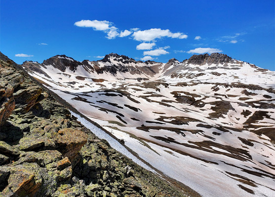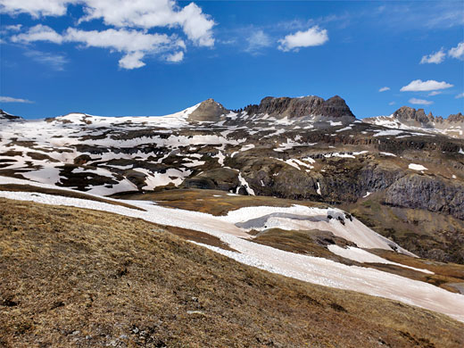 The forest ends abruptly not far beyond the meadow, and the path leaves the shady trees and enters a broad Alpine basin, framed by smooth slopes at either side, increasingly rocky higher up. Behind, to the east, is a grand vista across Mineral Creek valley towards countless other peaks and ridges in the central section of the San Juan Mountains. The trail is now straight, no more switchbacks, heading up the basin, crossing the creek once and alternating between almost level sections and short, steeper parts, on to the head of the valley, where it curves northwards, traverses a talus field and reaches a rocky saddle, below two minor peaks - a divide between the basin and the valley of Mill Creek to the north.