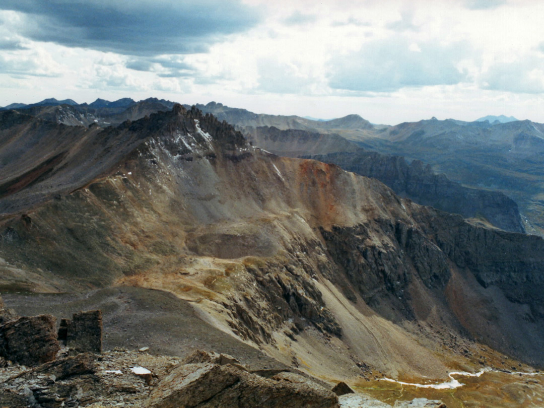 View south from a summit at 13,477 feet, east of Telluride, to Three Needles
