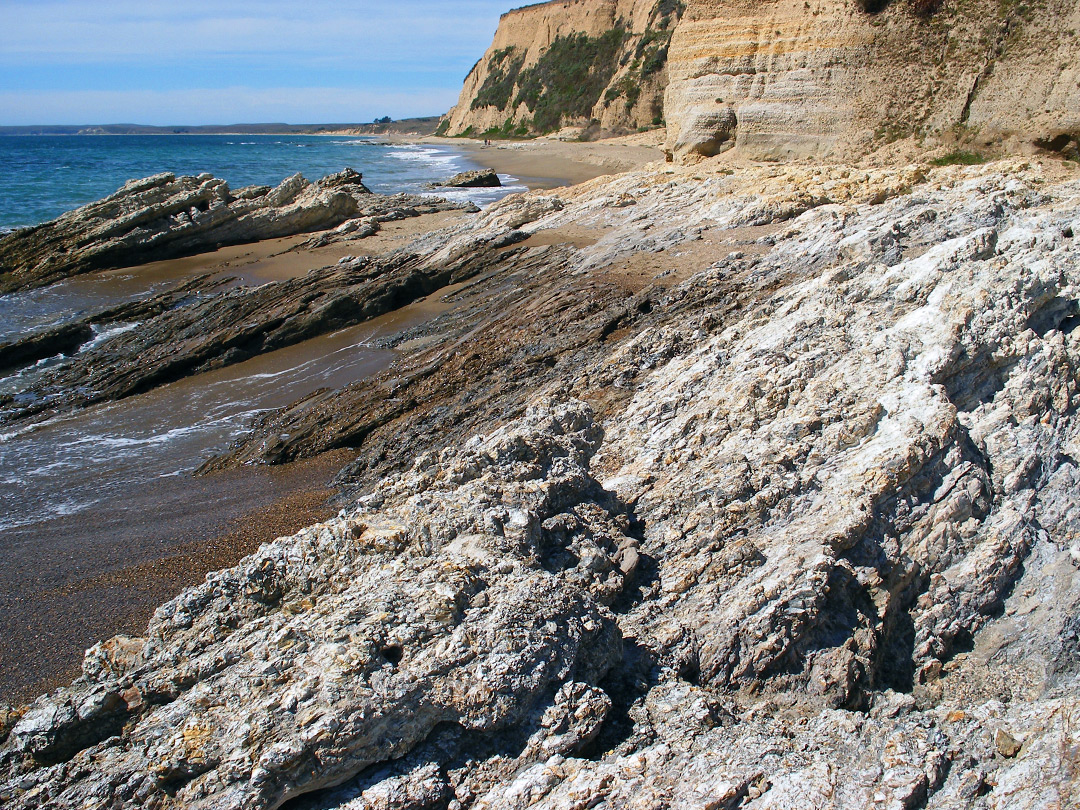 Sculptured Beach, since here the foot of the cliffs merge with inclined strata, eroded into a range of interesting forms. The beach is reached by a 2 mile walk along the sands starting at the end of Limantour Road, or a 6 mile hike from the park headquarters in Bear Valley.