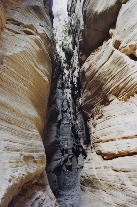 Bull Valley Gorge, though the canyon can usually be explored without too much effort. The drainage - an upper tributary of the Paria River - forms a one mile slot, through light-colored, thin-layered, angled Navajo sandstone, opening out at the lower end to a deep, shady ravine containing occasional pine trees. The access route (Skutumpah Road) crosses the slot near its upper end, and directly below the bridge is the unusual sight of the wreck of a pickup truck, wedged here ever since an accident in 1954.