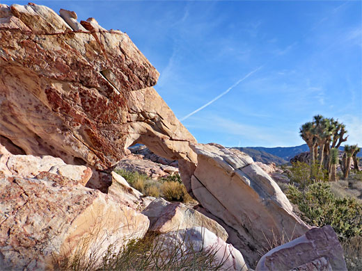 Whitney Pocket is reached by Gold Butte Road, which is mostly paved but the surface is old and damaged, so the drive is slow and bumpy. The petroglyphs are along a lesser track, Black Butte Road, forking south after 19.7 miles, in front of a red outcrop, shortly before the camping area at Whitney Pocket - down this narrow, stony road for 1.2 miles, over two dry washes, turning left at a junction (the right fork is rather less used) and on another 0.7 miles to a fenced parking place, in front of a pastel-colored sandstone butte, with large Joshua trees at its base.