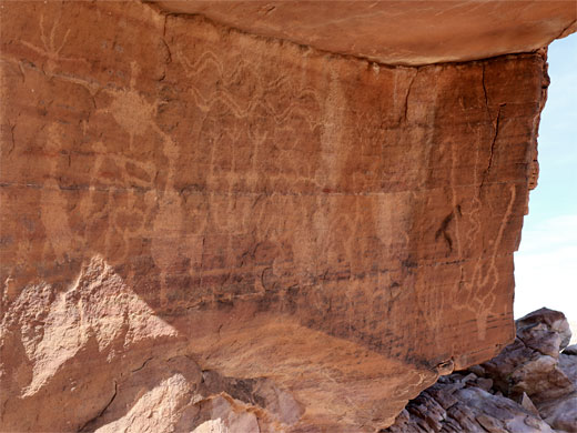 More petroglyphs can be found on the south side of the large butte containing the window and the falling man, including several spirals, while in the wider ravine to the southwest of the butte is newspaper rock, a boulder about 15 feet high, bearing perhaps the best panel in the area. On the south side of this ravine is another sizeable butte and at its base are more petroglyphs including two panels on the upper face of dropped boulders in alcoves - one has a range of shapes and spirals, the other a large foot. Nearby is 'the wall', a large grouping of designs, on several levels, this on the southwest side of the second butte. More are on the east side, including some bighorn sheep and a group of pinkish designs. A short cliff prevents a full walking circuit of this butte; one has to go part way round then back the other way, to see all the panels.