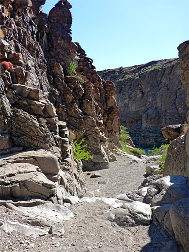Sparsely-vegetated volcanic peaks and rocky ravines south of Las Vegas, part of the McCulloch Range, home to bighorn sheep, and other Mojave Desert plants and animals. The most famous location is