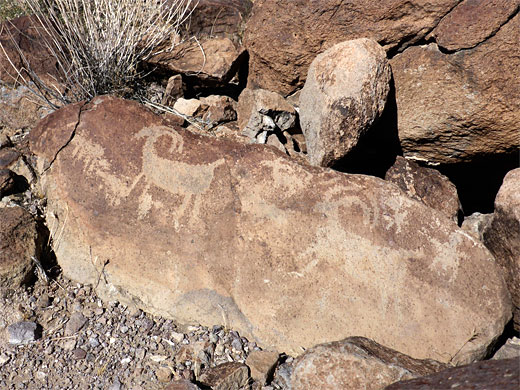 The Sloan Canyon region was designated an NCA in 2002, principally because of the rock art and other ancient relics, but also because of the interesting geology - features include ash deposits, lava flows and glassy metamorphosed rocks, and for the wildlife, particularly for the desert tortoise and bighorn sheep, both relatively abundant across the mountains and plains. The importance of Petroglyph Canyon was recognized earlier, in 1978, by inclusion in the National Register of Historic Places. The rock art ranges in age from prehistoric times, 3000 BC or older, up to pioneer settlers of the 19th century, though most is around 1000 years old. The land is somewhat threatened by the expanding Henderson suburbs, now encroaching into the foothills right up to the NCA boundary, and also by proposed developments to the west, between the mountains and the interstate, and to the south around the currently uninhabited Hidden Valley, location of the south end of the trail through Petroglyph Canyon.