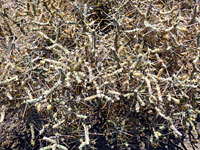 The rock art gradually becomes less widespread as the drainage slowly gains height, then bends to the southwest, past one tributary and on to another, on the north side. The confluence marks the upper end of trail 100, and also of trail 200, used as the return route, up the tributary. Another trail (300), continues south for 2.6 miles, over a saddle and down a wide alluvial plain to the remote Hidden Valley trailhead, on the far side of the mountains. The completely undeveloped valley beyond, centered on a dry lake bed, is under threat from future housing developments. Trail 200 climbs up the tributary ravine to a divide that gives grand views of the mountains then descends another, similarly-sized valley back to the initial junction.