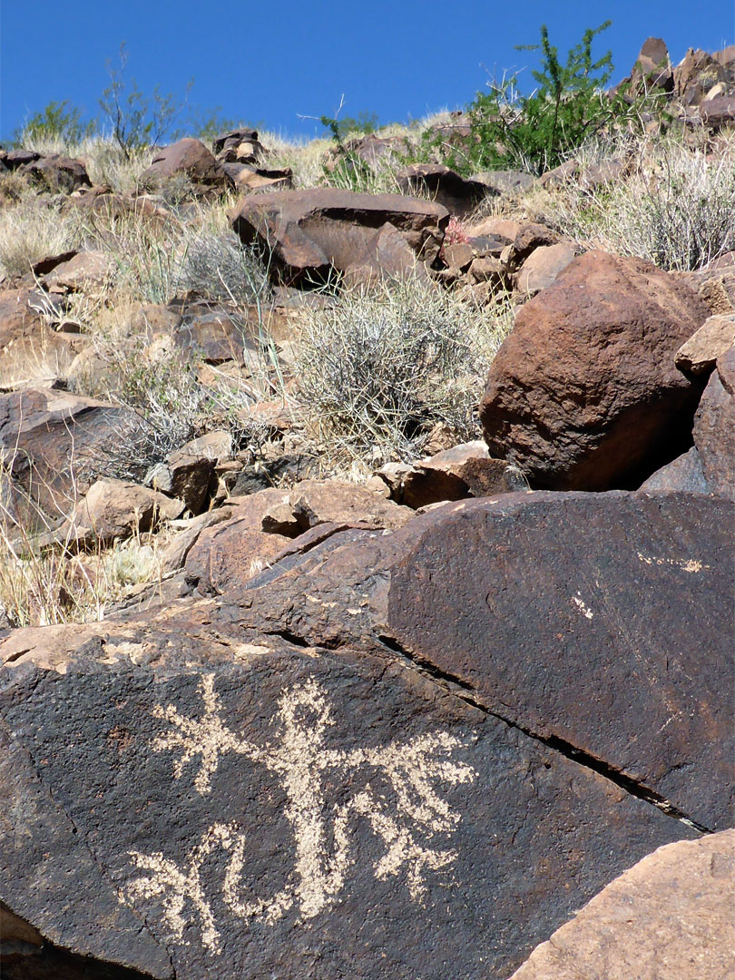 Anthropomorphic petroglyph on a dark-colored boulder