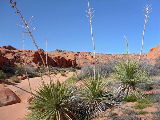Valley of Fire State Park, the majority are either within the main band of formations, but rather short, or are longer routes to the south, across open desert. Cliffs and ravines restrict cross-country hiking in the rockier areas, but several washes provide easier routes and in the most colorful region there are three that may be followed;