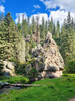 Las Conchas Trail, easy and nearly level, following the river downstream along a shallow canyon up to a point where the water covers all of the valley floor, from cliff to cliff. The river is lined by colorful, jagged walls of rhyolite lava, rising above patches of ponderosa pine woodland and lush meadows filled with a great variety of wildflowers.