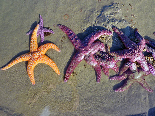 The coastal landscapes are fascinating to explore - often without any other people around, and are excellent for photography, offering both large scale vistas and smaller features. The variety of habitats include beaches, rock pools, sea stacks, succulent-covered hillsides, sand dunes and eroded rocks, in particular the unusual 'tafoni', where sedimentary rocks weather to form strange potmarked structures. Wildlife is quite varied, with gray whales visible at some times of year, seals and sea lions on the inaccessible rocks just out to sea, urchins, sea stars, crabs and anemones in the rock pools, and many kinds of birds. Although broadly similar, no single area is exactly the same, since differences such as rock type (igneous or sedimentary), cliff height, extent of sand, angle of the sea bed and curvature of the coast create an endless variety of scenery, enough for many days of exploration. The only negative aspect is the fog, which can obscure much of the coast for days at a time.