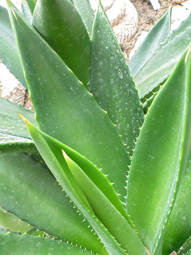 The bright green leaves are (usually) up to 40 inches long and 4 inches wide, lined by small teeth at half-inch intervals. Smaller interstitial teeth may sometimes be present. Leaves taper to a light brown spine. The upper surfaces of the leaves are nearly flat towards the base, becoming concave towards the tip; lower surfaces are convex around the base.
