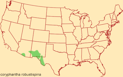 Although small, coryphantha robustispina has an unusual, distinctive appearance, its compact globes covered by extra long tubercles bearing especially thick spines; both radials (6 to 16) and the slightly curved centrals (1 to 4) are stout, darkish in color and point in all directions, creating a very spiny plant. The yellow flowers open any time between spring and early fall, triggered by rainfall.