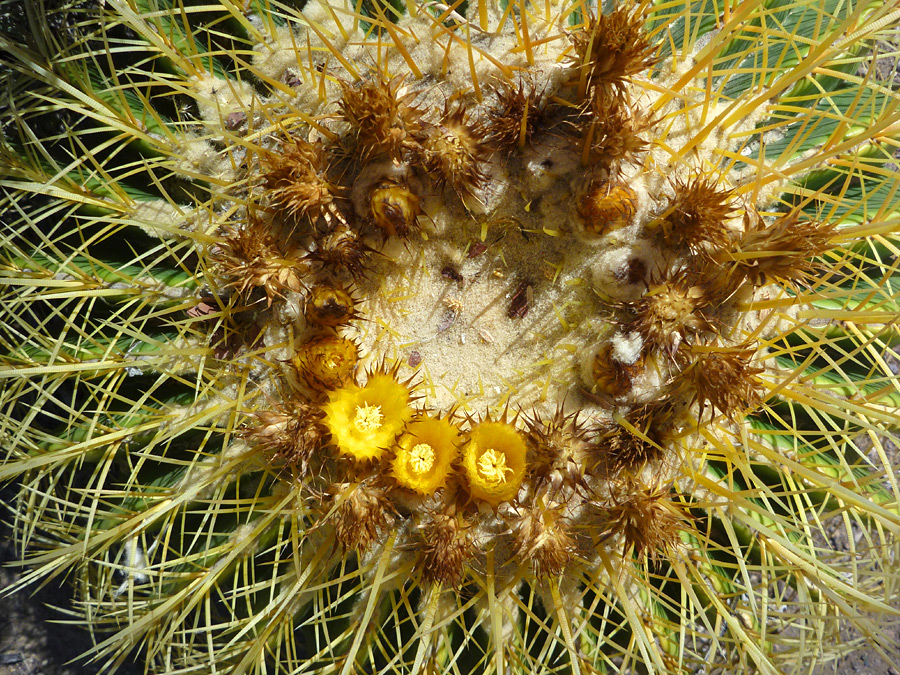 Yellow flowers, on an old specimen of echinocactus grusonii, Boyce Thompson Arboretum, Arizona