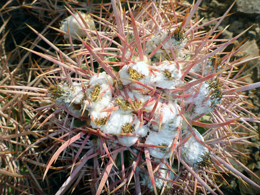 Echinocactus polycephalus is found all over the Mojave Desert, in four states, and is easily recognizable since it forms conspicuous mounds of large, spherical plants (up to 9 inches across), each protected by a dense mat of long, thick spines, growing on narrow ribs. Clusters may have up to 50 individuals, though 10 to 20 is more common. The grey, pale yellow or reddish spines (up to 5 inches long) are covered with a thin, felt-like substance, which weathers away after a few years. Spines grow on narrow ribs - 10 to 20 of them - with 4 long centrals and up to 15 shorter radials.