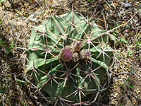 The cactus is usually (at least) twice as wide as it is high, and may reach a diameter of 12 inches. Ribs are wide and prominent, bearing clusters of spines at intervals of 1 to 2 inches. All spines have narrow lateral grooves; the 5 to 7 radials are shorter, but still thick and sharp, while the single, downwards-pointing central spine is longer, up to 3 inches. Both the salmon pink flowers and bright red fruits are quite striking, and the plant is popular amongst cacti collectors, partly due to its resilience, being both frost-hardy and tolerant of increased watering.